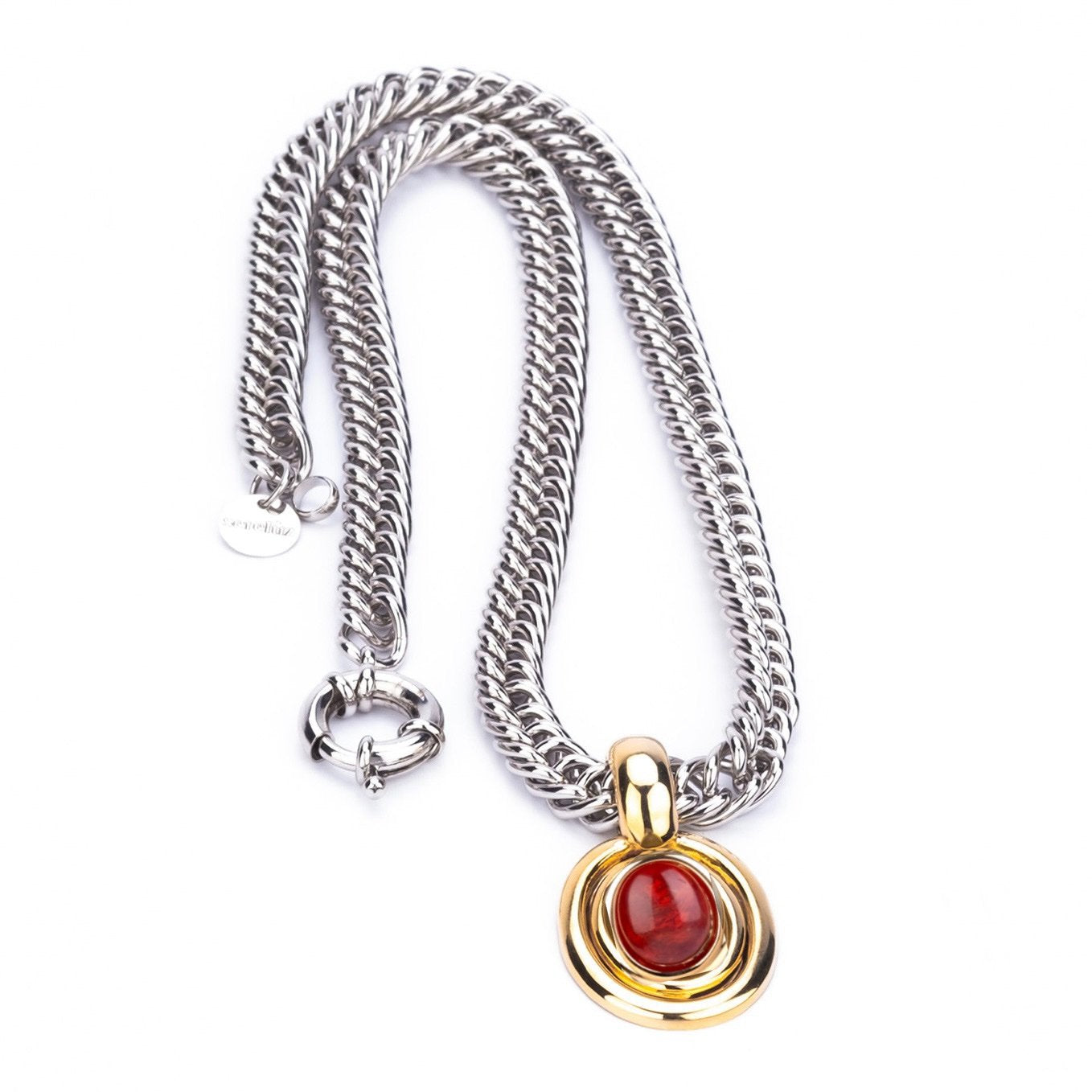 La nostra catena C A R L O T T A è l'ideale per arricchire la scollatura con un tocco di colore: il ciondolo bagnato in oro 24kt è disponibile nelle varianti colore ambra, osso, blu e oliva. Massimizza il look abbinandola alla catena M Y R I A M e al girocollo S A R A H oppure alla linea di orecchini coordinati. ORA DISPONIBILE ANCHE NELLA VARIANTE RUBINO