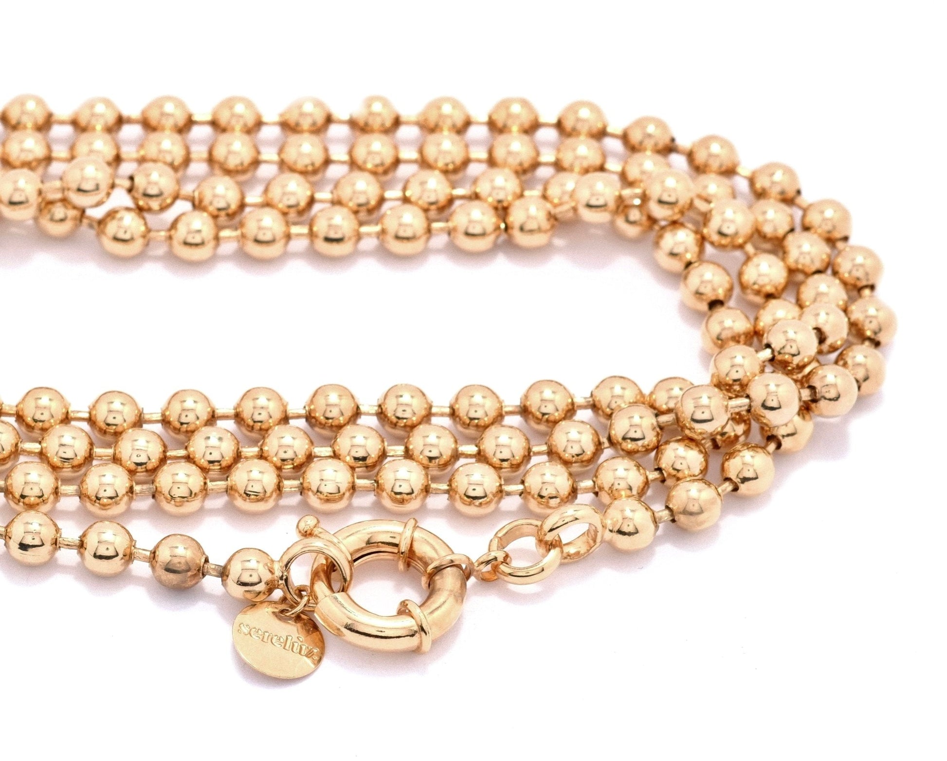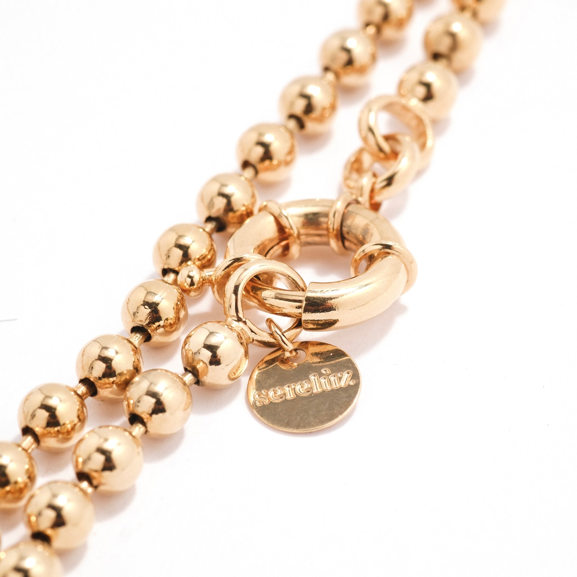 Collana, bodychain o bracciale? R O S A R I A può essere tutto ciò che desideri! Maxi filo di sfere in ottone placcate oro 24kt o palladio, misura 120cm ed è adattabile a varie vestibilità, rendendola un pezzo irrinunciabile della collezione Serelùz SS24.