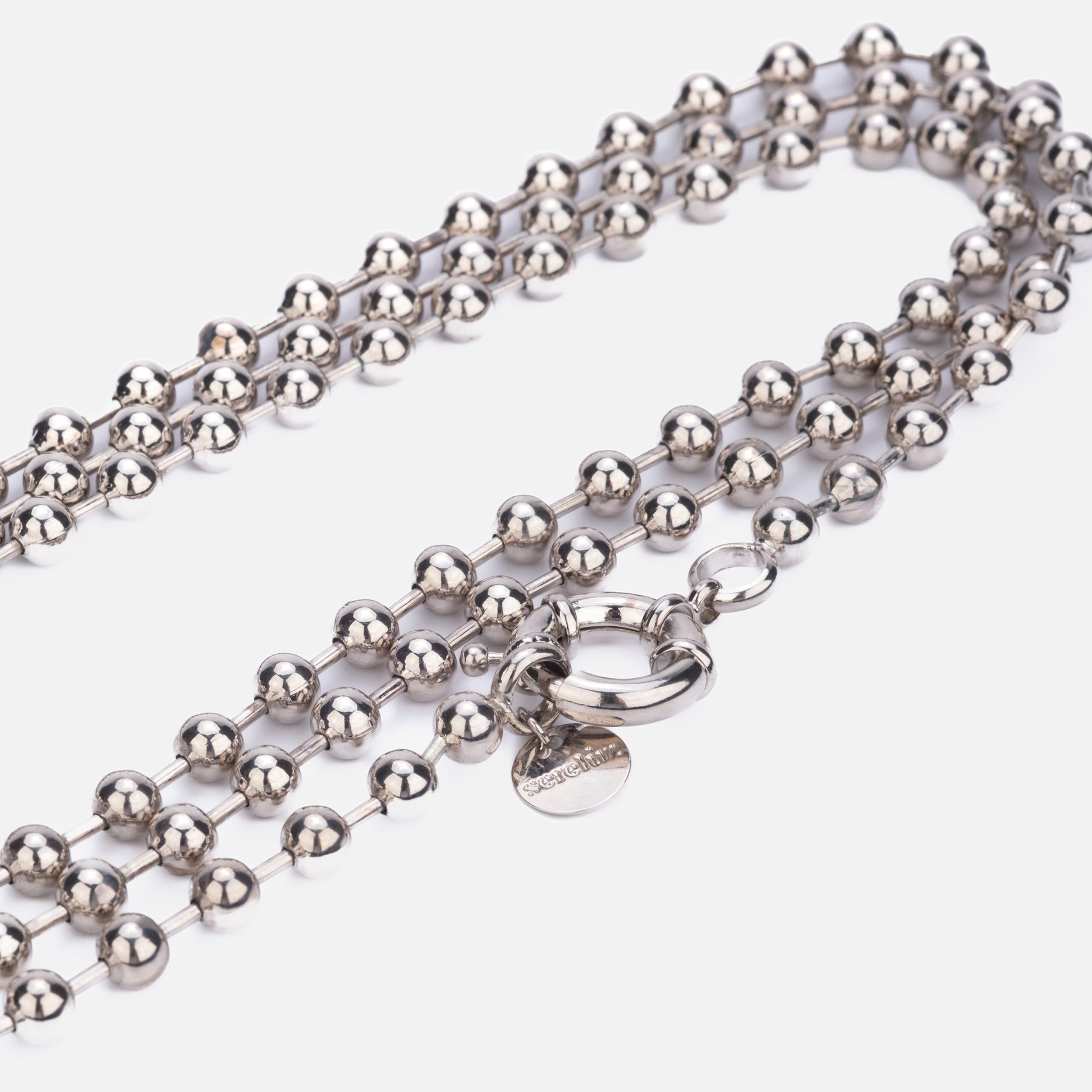 Collana, bodychain o bracciale? R O S A R I A può essere tutto ciò che desideri! Maxi filo di sfere in ottone placcate palladio, misura 120cm ed è adattabile a varie vestibilità, rendendola un pezzo irrinunciabile della collezione Serelùz SS24.